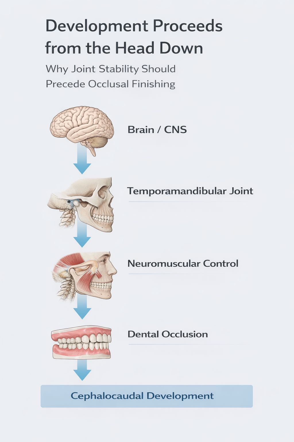 Human development follows a cephalocaudal pattern, meaning growth and neurologic control progress from the head downward. Cranial structures develop and organize before structures farther down the body (Moore et al.; Carlson; Sadler). In the craniofacial system, the temporomandibular joints sit superior to the occlusion. From a developmental standpoint, this reinforces a fundamental orthopedic principle: stable joints should guide the bite—not the other way around. Click here for references.